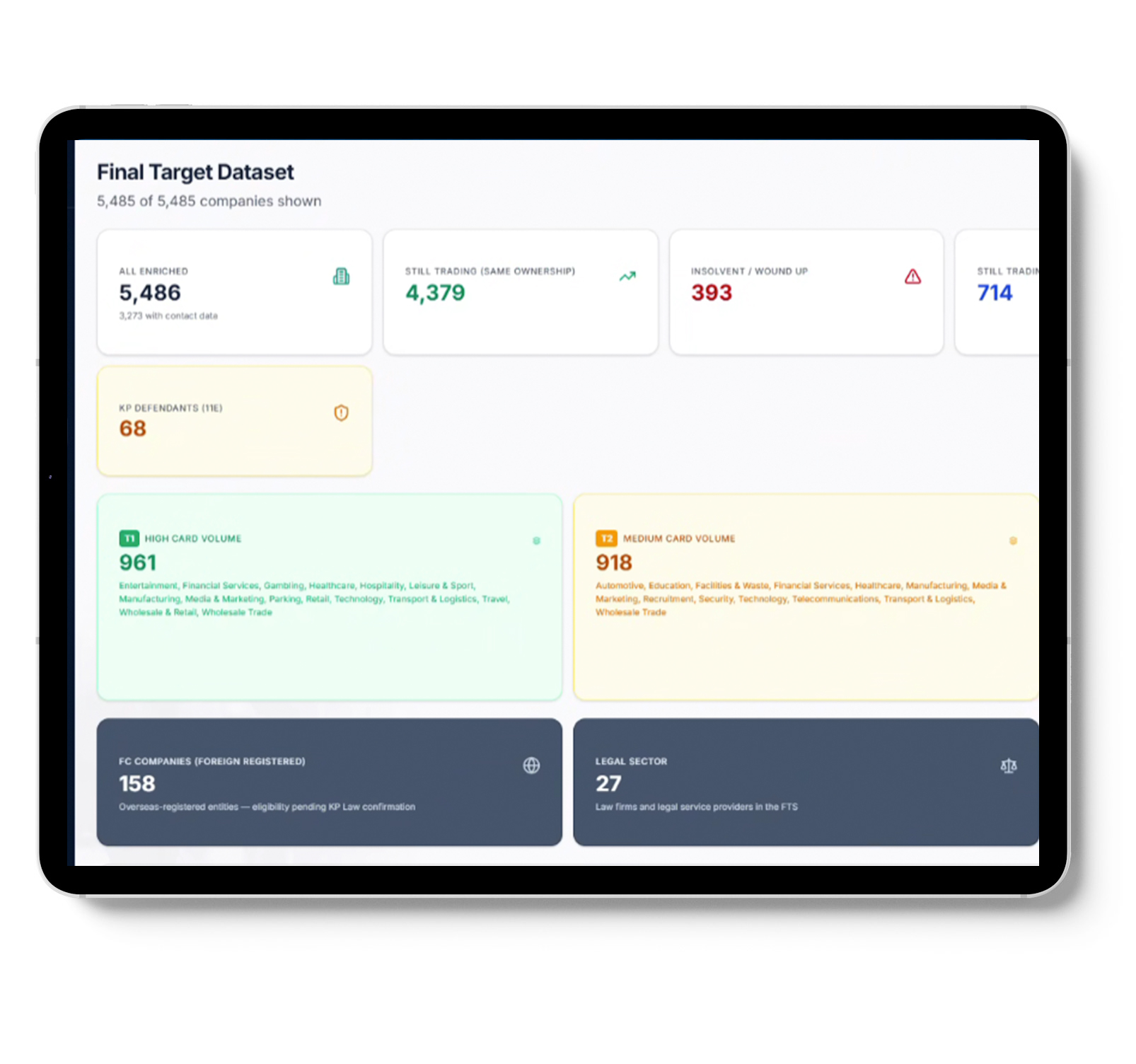 Size and composition of total available market – AI-driven analysis of Companies House data, financial filings, and corporate structures surfaces every eligible entity against your specific claim criteria — turnover thresholds, trading periods, sector filters, geographic scope.